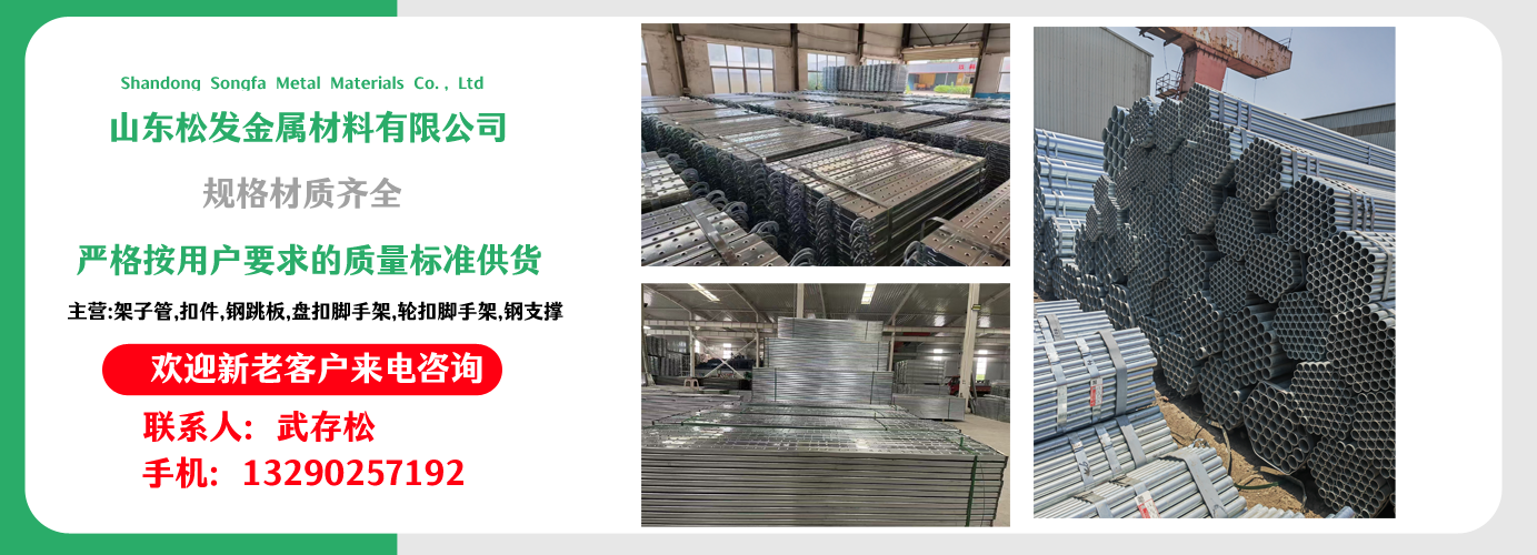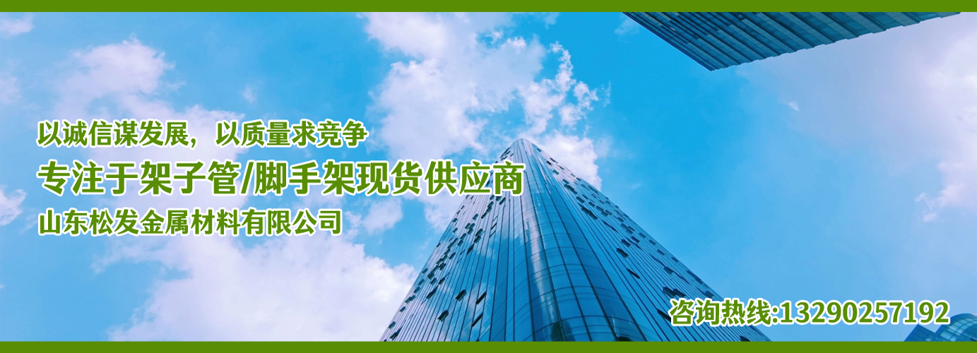 山東松發金屬材料有限公司主營架子管,扣件,鋼跳板,盤扣腳手架,輪扣腳手架,鋼支撐生產廠家。本廠專業生產銷售?! 〗ㄖ眉茏庸堋?主要用于房建,橋梁,鐵路,公路,地鐵,水庫,隧道,支撐?! 〖茏庸?扣件,鋼跳板,盤扣腳手架,輪扣腳手架,鋼支撐的優越性及應用“ ”產品因具有結構簡單合理、設計巧妙、使用方便、安全、快捷、易于運輸、儲存、維護簡單等特點?! 」疽回瀳猿帧百|量,用戶至上,優質服務,信守合同”的宗旨,憑借著高質量的產品,良好的信譽,優質的服務,產品暢銷全球。歡迎廣大客戶來電洽談,共同發展,共創輝煌!  山東松發金屬材料有限公司秉承誠信服務、恪守信譽的宗旨,在同等的質量下,保證以最低的價格,最完善的服務,最高的信譽來答謝各界朋友的支持和厚愛,歡迎您的來電、咨詢,我們將竭誠為您服務!...